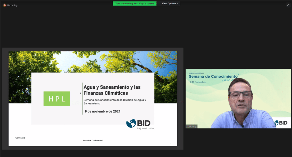 Kurt Vogt, Managing Director at HPL, participated as an expert panelist alongside Carole Sanz-Paris, Head of Debt Capital Markets & Structured Finance at BID Invest; Isabelle Braly-Cartillier, Senior Financial Specialist at IDB; and Alma Agustí, Senior Associate at Instiglio, in a panel hosted by IDB’s Water and Sanitation Division, and moderated by Lucio Javier García, Water and Sanitation Specialist at IDB. In this session, Kurt presented and discussed the applications of climate finance in the water and sanitation sector in Latin America and the Caribbean.