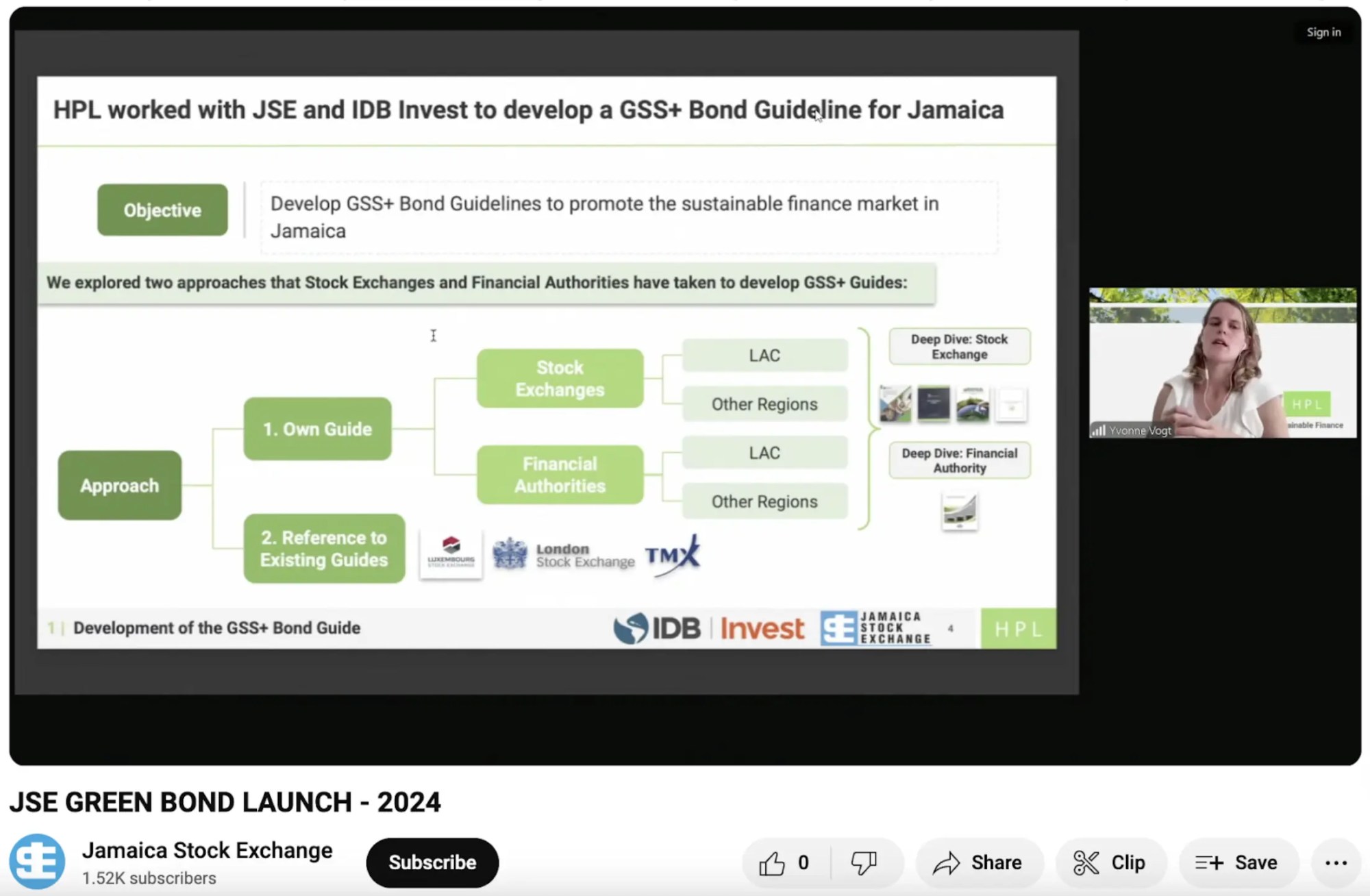 HPL Consultant, Yvonne Vogt, participated virtually in the launch event of the Green, Social, Sustainability, and sustainability-Linked (GSS+) bond guide for the Jamaican market, presenting the work developed by HPL in the preparation of the Guide, whose objective is to provide the market with tools for the issuance of these types of instruments and to promote the advancement of sustainable finance in the country.