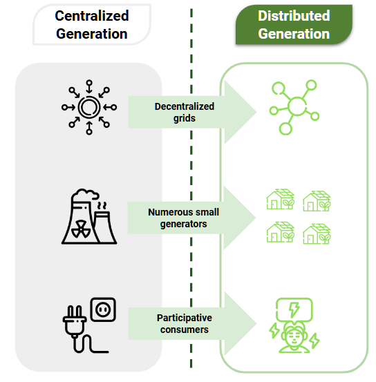 Energetic systems, in the context of a just and inclusive energy transition, are facing substantial changes in their way of generating, selling, distributing, and consuming these resources. Electrification, which is a key condition for the clean energy transition, is increasing power consumption and the quantity and variety of electrical equipment that can shift their demand. In this context, Distributed Generation (DG) systems play an important role. DG encompasses various technologies that produce electricity close to or at the location where it will be consumed. They are decentralized and bidirectional distribution systems that help consumers be more proactive in the power markets [1]. Figure 1 illustrates the difference between centralized and DG systems.